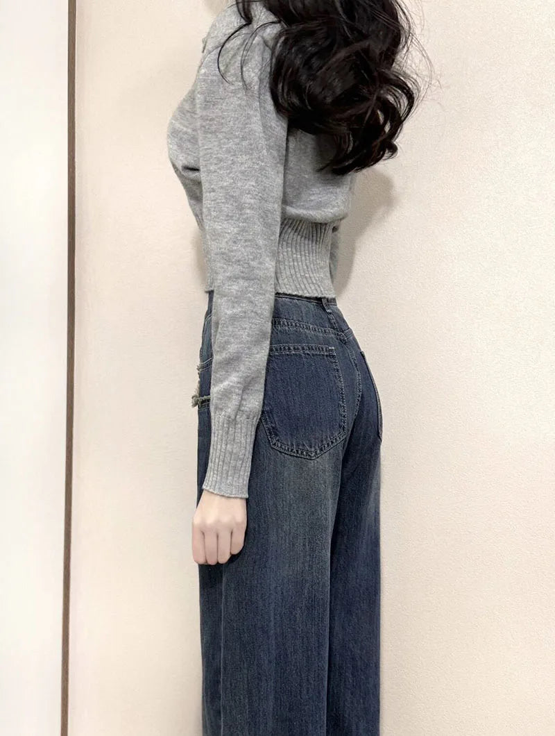 Korean Chic Turndown Collar Sweaters Female Gray Slim Fit Long Sleeve Cropped Sweater for Woman Streetwear Knit Pullovers