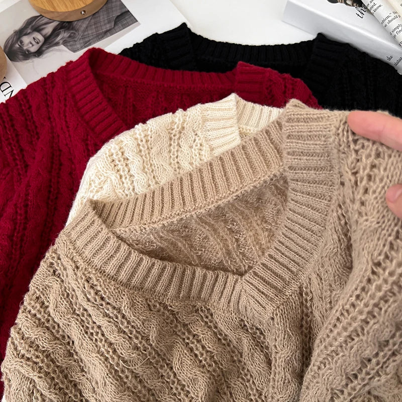2026 New Autumn Winter Loose Casual Knitwear V-neck Long Sleeve Knitted Sweaters Twist Hollow Out Crochet Short Pullover Tops