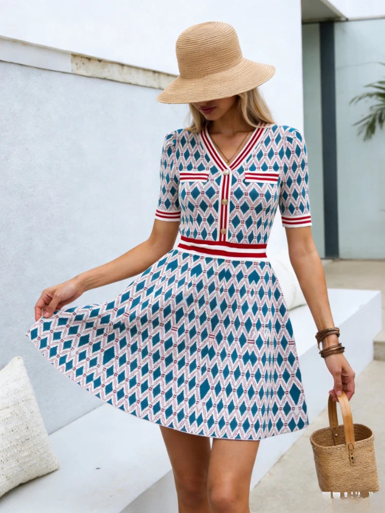 Women's V-Neck Short Sleeve Knit Dress Geometric Argyle Print Contrast Trim Flare Mini Dress Casual Summer Daily Party Dress