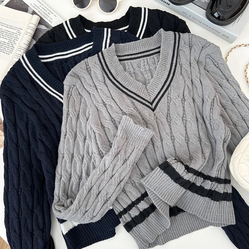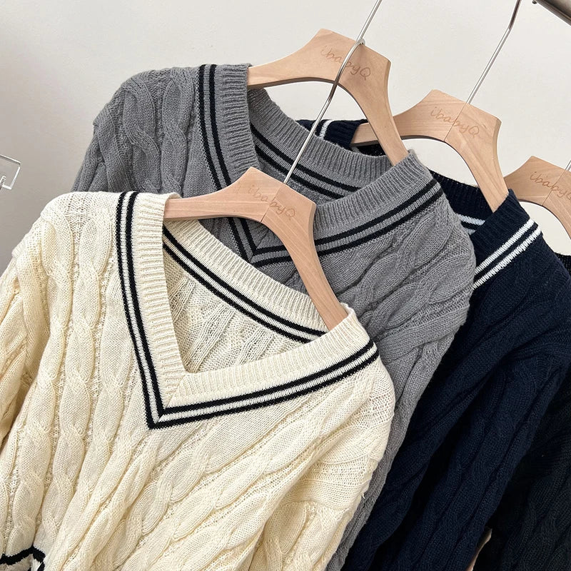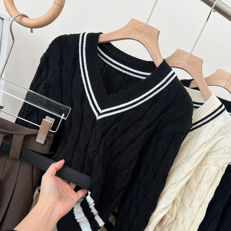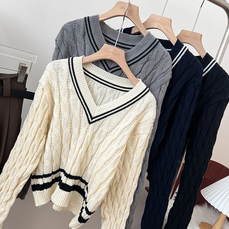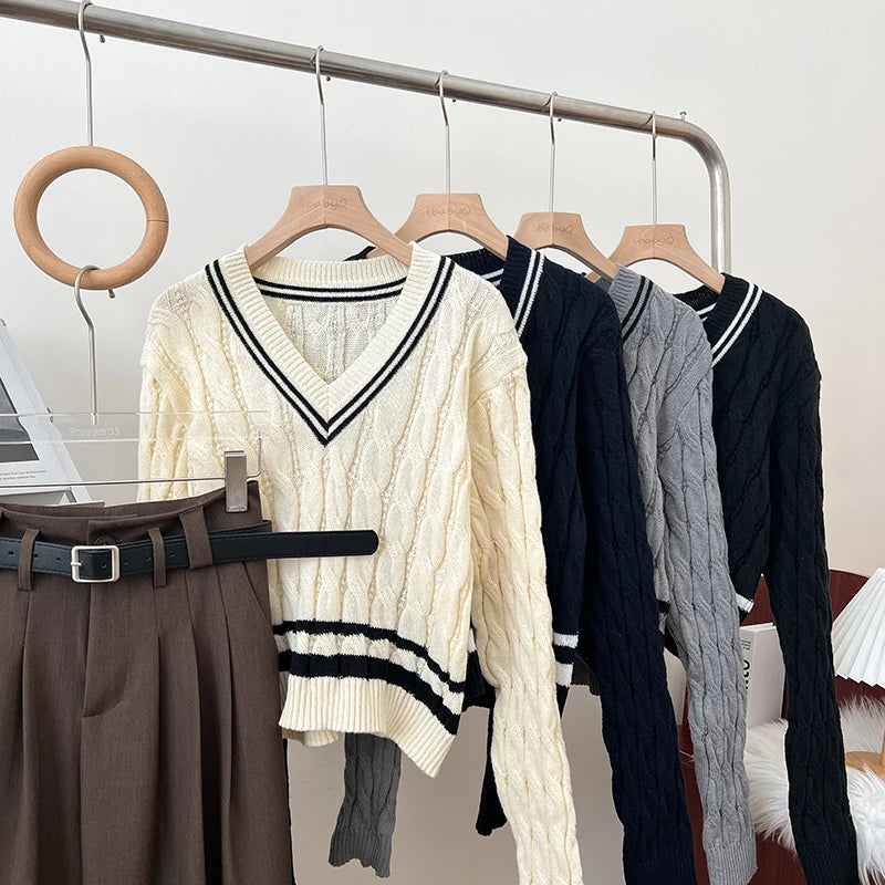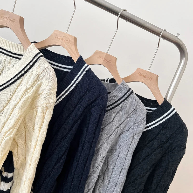 2026 New Autumn Winter Preppy Style Knitwear V-neck Long Sleeve Knitted Sweaters Twist Hit Color Striped Short Pullover Tops