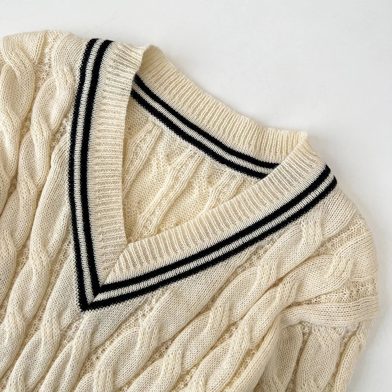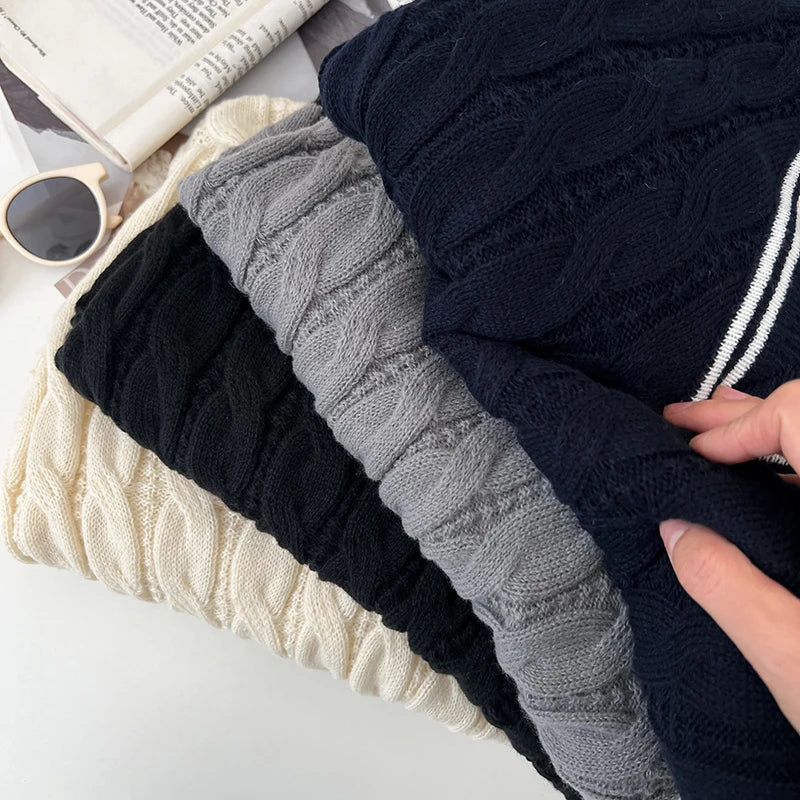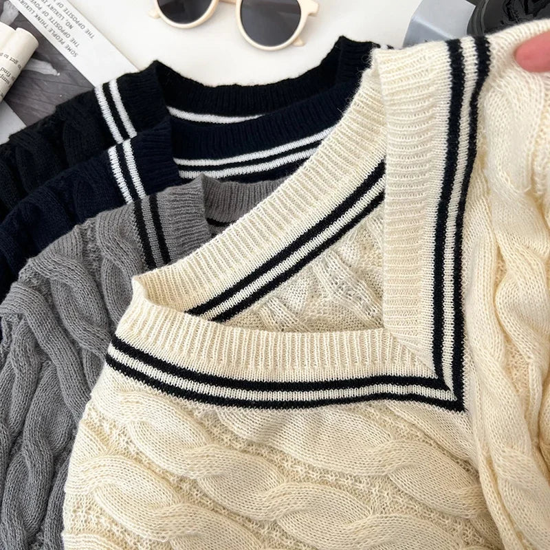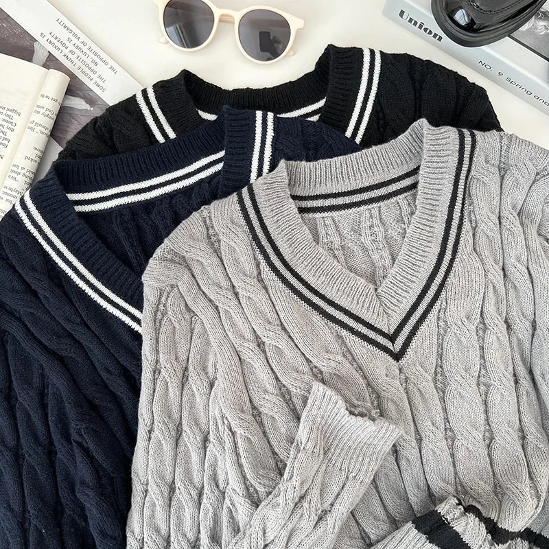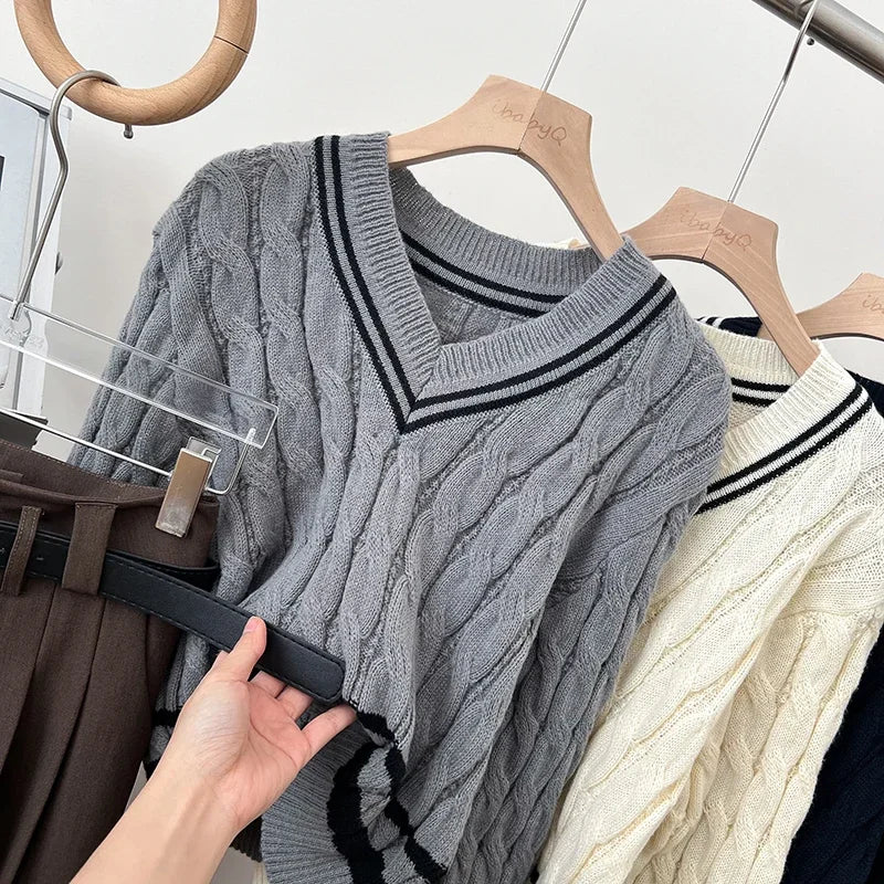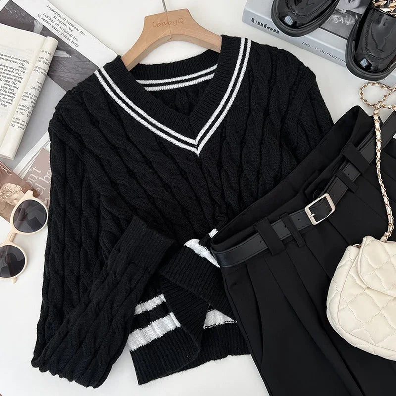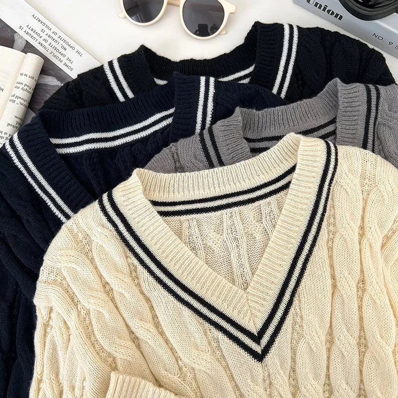 2026 New Autumn Winter Preppy Style Knitwear V-neck Long Sleeve Knitted Sweaters Twist Hit Color Striped Short Pullover Tops